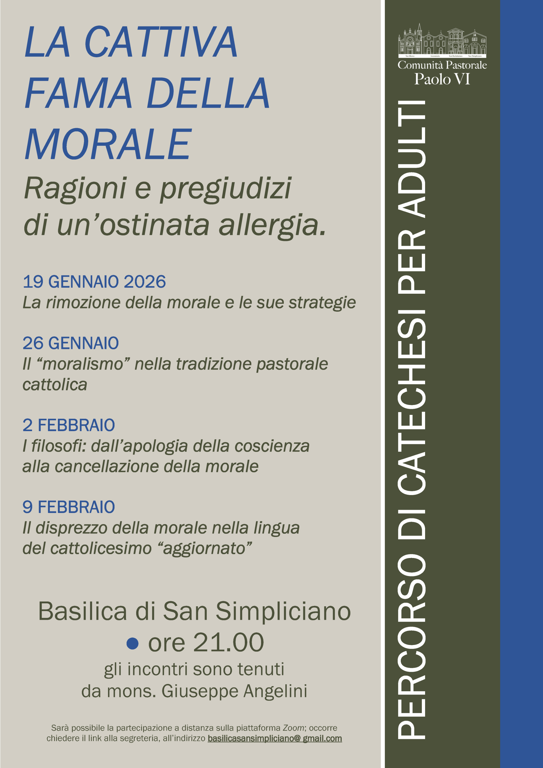 Presentiamo le proposte pastorali della nostra Comunità pastorale per i primi mesi del 2026, fino alla Pasqua. Sono percorsi offerti come occasioni per approfondire la fede in Gesù e per riprendere alcuni temi centrali per la fede che nel tempo di oggi hanno bisogno di una rilettura per nutrire l’anima. Alcune di queste proposte avranno una modalità “di confine”: cercheremo i segni della presenza di Dio anche attraverso la musica, la letteratura e l’arte.
