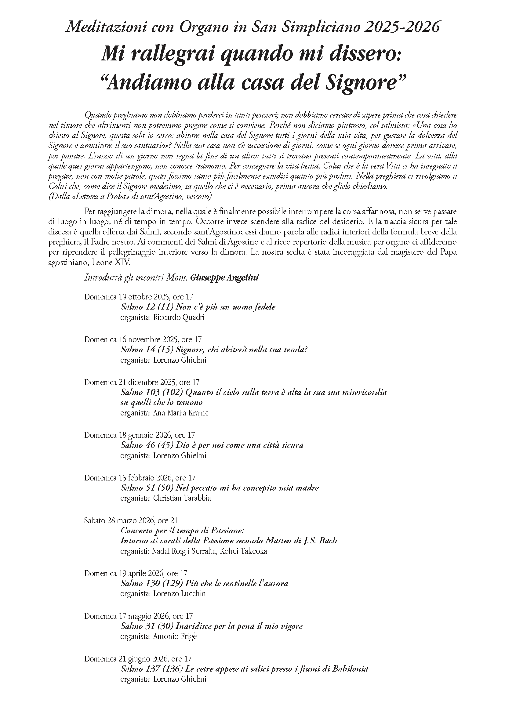 Meditazioni con Organo in San Simpliciano 2025-2026 29 Settembre 2025 Pagina degli incontri Articoli correlati RITORNARE CATECUMENI? – Leggiamo insieme il Vangelo di Marco LE GUARIGIONI E IL VANGELO – Ciclo di Lectio d’Avvento 2025 IL MISTERO DI CRISTO NEL TEMPO – Percorso di incontro con testimoni che incontriamo nella liturgia.
